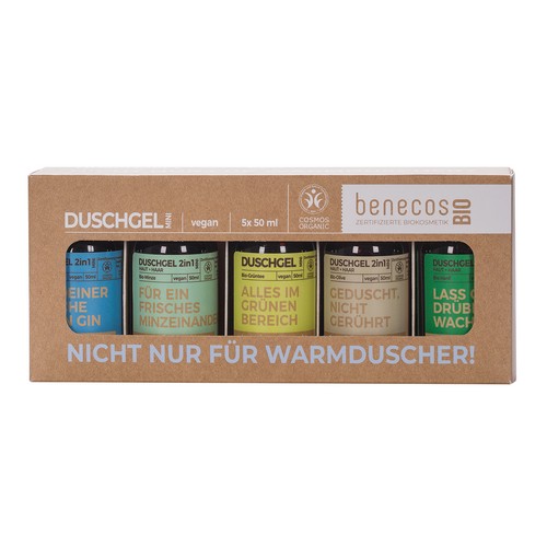 mit fünf ausgewählten benecos BIO Mini-Duschgelen.