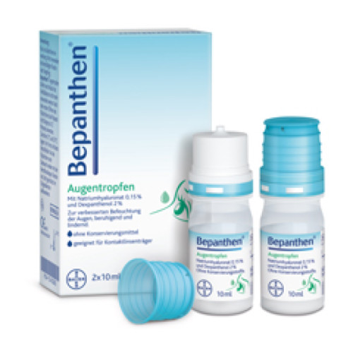 Wer an trockenen und gereizten Augen leidet, kann mit den Bepanthen® Augentropfen die Augenoberfläche befeuchten, den Tränenfilm stabilisieren und somit das Auge vor einem Trockenheitsgefühl schützen. Auf diese Weise wird eine Linderung der Beschwerden erreicht. Die Bepanthen® Augentropfen sind erhältlich als Ein-Dosis-Behältnis (praktisch für unterwegs) und in der Soft-Touch-Mehrdosisflache (insbesondere zur regelmäßigen Anwendung). Die Augentropfen enthalten weder Konservierungsstoffe noch Phosphate. Sie sind für Kontaktlinsenträger geeignet.