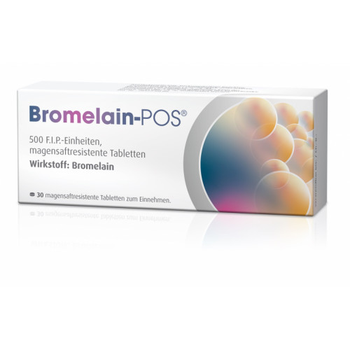 Bromelain-POS®, 500 F.I.P.-Einheiten, magensaftresistente Tabletten. Wirkstoff: Bromelain. Anwendungsgebiete: pflanzliches Arzneimittel zur Begleittherapie bei akuten Schwellungszuständen nach Operationen und Verletzungen, insbesondere der Nase und der Nebenhöhlen.