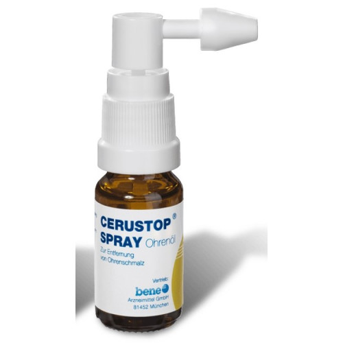 Mit CERUSTOP® Ohrenöl-Spray entfernen Sie überschüssiges oder verhärtetes Ohrenschmalz (Cerumen) ganz einfach. Die physiochemischen Eigenschaften des Produkts lassen es tief in das Schmalz eindringen und lösen es an. Außerdem reinigt CERUSTOP® die Ohrmuschel und den äußeren Gehörgang schonend. Die hautpflegenden Inhaltsstoffe Mandelöl und Vitamin E schützen Ihre Haut vor dem Austrocknen und lösen gleichzeitig verhärtetes Ohrenschmalz. CERUSTOP® Ohrenöl-Spray kommt ohne Glycerol aus und reizt das Ohr nicht.