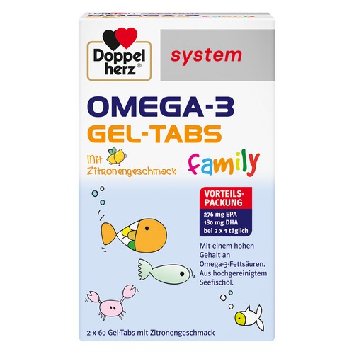 Dank einer neuen Herstellungstechnologie bietet Doppelherz system OMEGA-3 familiy einen hohen Gehalt der wertvollen Omega-3-Fettsäuren EPA und DHA in Form von fruchtig schmeckenden Gel-Tabs. Diese Darreichungsform ist für Kinder, Jugendliche und Erwachsene, also für die ganze Familie gut geeignet.