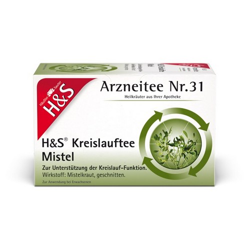H&S Kreislauftee Mistel. H&S® Kreislauftee Mistel ist ein traditionelles Arzneimittel zur Unterstützung der Kreislauffunktion. Dieses Arzneimittel ist ein traditionelles Arzneimittel, das ausschließlich aufgrund langjähriger Anwendung für das Anwendungsgebiet registriert ist. Beim Auftreten von Krankheitszeichen, insbesondere bei zu hohem Blutdruck, sollte ein Arzt aufgesucht werden. Der Anwender sollte bei fortdauernden Krankheitssymptomen oder beim Auftreten unerwünschter Arzneimittelwirkungen einen Arzt oder eine andere in einem Heilberuf tätige qualifizierte Person konsultieren. Zu Risiken und Nebenwirkungen lesen Sie die Packungsbeilage oder fragen Sie Ihren Arzt oder Apotheker. H&S Tee-Gesellschaft mbH & Co. · Heidachstr. 62 · D-88079 Kressbronn/Bodensee.