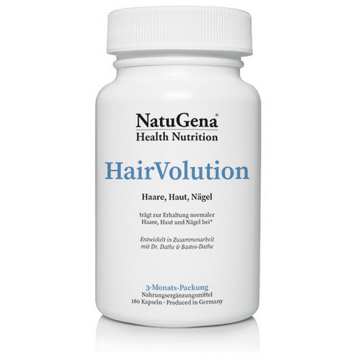 HairVolution ist eine fein abgestimmte Nährstoffformel mit natürlichen Vitalstoffen wie Bockshornklee, Aprikosenkern, Acker-Schachtelhalm, Acai-Beeren und vielen bioaktiven Vitaminen und Mineralstoffen für kräftiges Haar und eine straffe Haut.