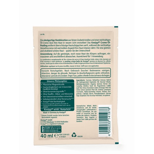 Die einzigartige Kombination aus feinen Zuckerkristallen und einer reichhaltigen Öl-Creme lässt Ihre Haut in neuem Licht erstrahlen! Das Kneipp® Creme-Öl-Peeling entfernt überschüssige Hautschüppchen sanft, während die reichhaltige Verwöhncreme mit wertvollem Arganöl Ihre Haut intensiv nährt. Für eine glattere und strahlend schöne Haut - spüren Sie den Unterschied!
