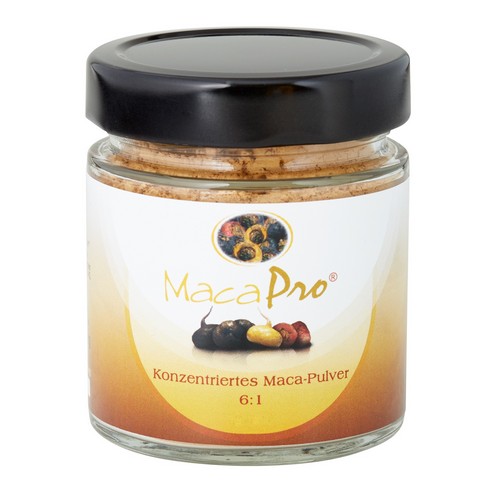 Maca (Lepidium Meyenii Walp) ist eine Wurzel die nur in den Hochlandzonen der peruanischen Anden wächst, auf dem Junin Plateau, auf einer Höhe von 4.250 Meter. Die widerstandsfähige Pflanze ist seit jeher Teil der Nahrung und wird bereits weltweit auf Grund der vielfältigen, positiven Eigenschaften verzehrt. MacaPro Pulver 6:1 ist ein konzentriertes Maca-Pulver aus ausgewählten, dunklen Maca-Wurzeln – 80 % schwarze Maca, 15 % purpurne Maca und 5 % gelbe Maca. Es erfüllt die Kriterien für Rohkost und der EU – Bio – Verordnung. Der einzigartige und sehr schonende Herstellungsprozess erlaubt ein stärker konzentriertes Pulver, welches vom Körper leichter aufgenommen und verdaut werden kann.