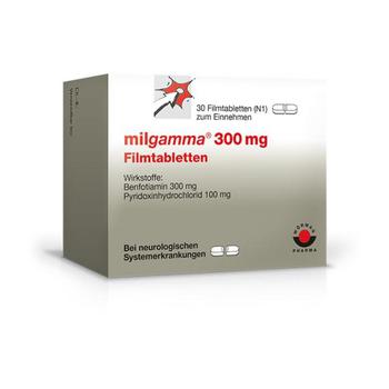 milgamma® 300 mg Filmtabletten. Wirkstoff: Benfotiamin, Pyridoxinhydrochlorid (Vitamin B6). Anwendungsgebiete: Neurologische Systemerkrankungen durch nachgewiesenen Mangel an Vitamin B1 und B6. Zu Risiken und Nebenwirkungen lesen Sie die Packungsbeilage und fragen Sie Ihre Ärztin, Ihren Arzt oder in Ihrer Apotheke.