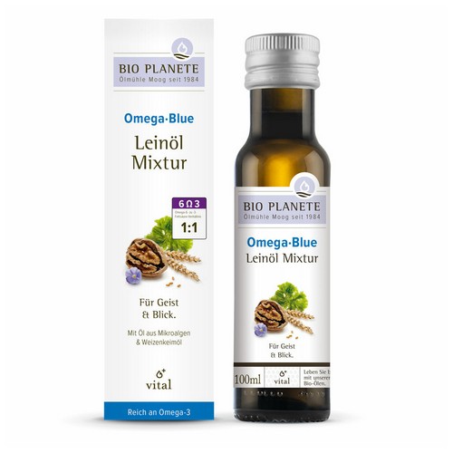 Omega Blue enthält wertvolle Inhaltsstoffe aus dem Meer. Die Grundlage der Mischung ist mild-nussiges Leinöl aus 3D-Filtration. Die Fettsäure DHA (Docosahexaensäure) aus biologischem Algenöl verleiht der Mixtur das besondere Etwas. DHA trägt bei einer täglichen Aufnahme von 250 mg zur Erhaltung der normalen Gehirnfunktion sowie einer normalen Sehkraft bei. 100 % Bio.