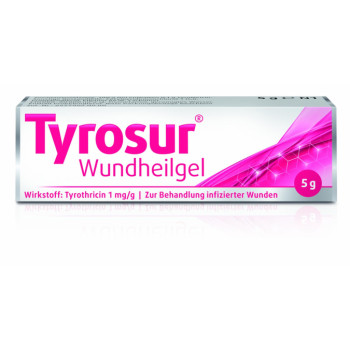 * Tyrosur® Wundheilgel/Wundheilpuder ist ein Wundbehandlungsmittel. Zur lindernden Behandlung von kleinflächigen, oberflächlichen, wenig nässenden Wunden mit bakterieller Superinfektion mit Tyrothricin-empfindlichen Erregern wie z. B. Riss-, Kratz-, Schürfwunden.