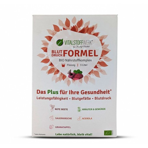 Die Vitalstoffwerk Blutdruckformel ist ein leckerer, gesunder Rote Bete Saft mit weiteren gesunden Inhaltsstoffen verfeinert. Reichlich Vitamin C und Kalium, welches zu einer Aufrechterhaltung des normalen Blutdrucks beiträgt, sind enthalten.
