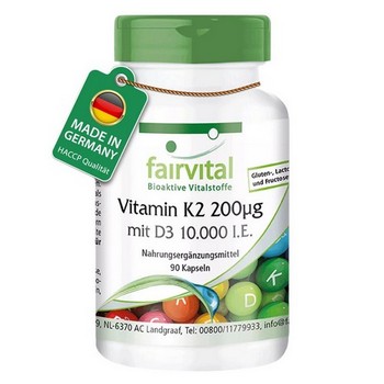 Dieses sinnvoll kombinierte Nahrungsergänzungsmittel von Fairvital enthält hochdosiertes Vitamin K2 in der Form von MK-7 und hochdosiertes Vitamin D3 als Cholecalciferol.