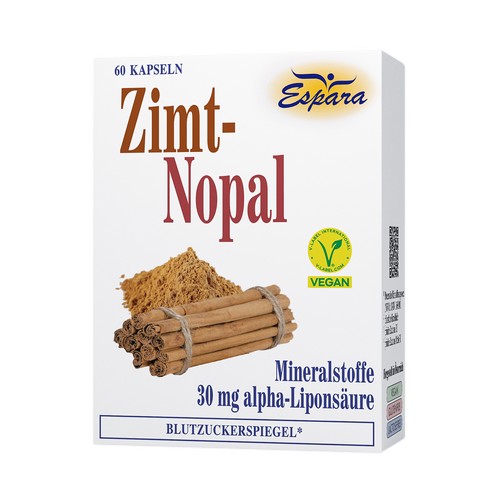 Nahrungsergänzungsmittel mit Vitamin E, Mineralstoffen (Zink, Chrom) in Kombination mit Zimt, Nopal-Kaktus und alpha-Liponsäure.